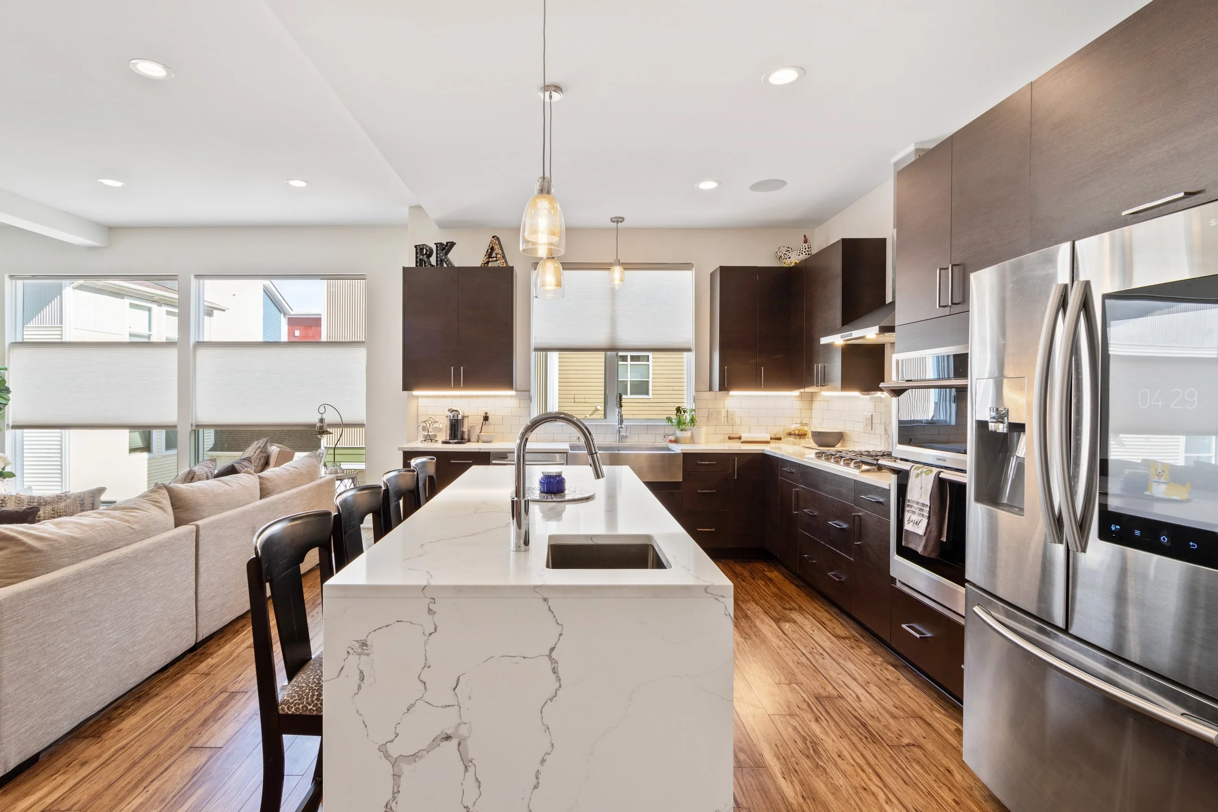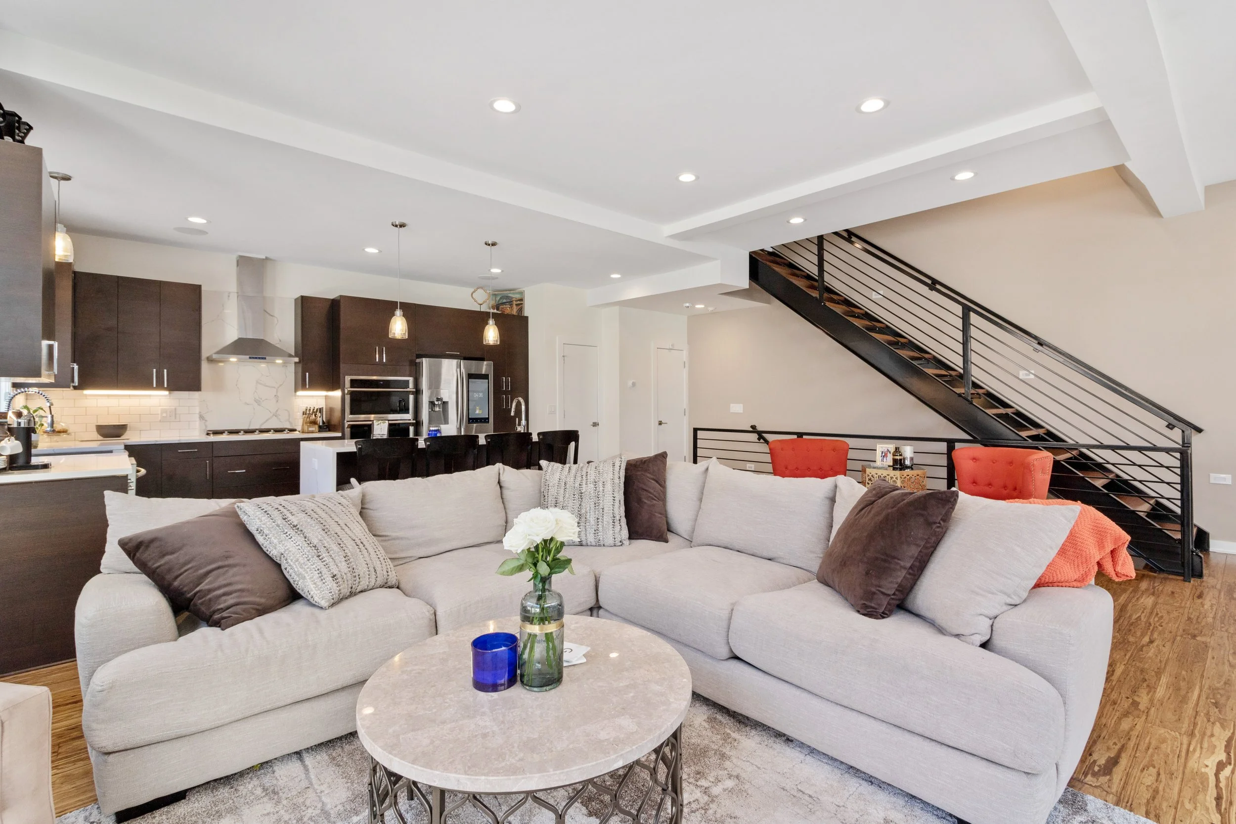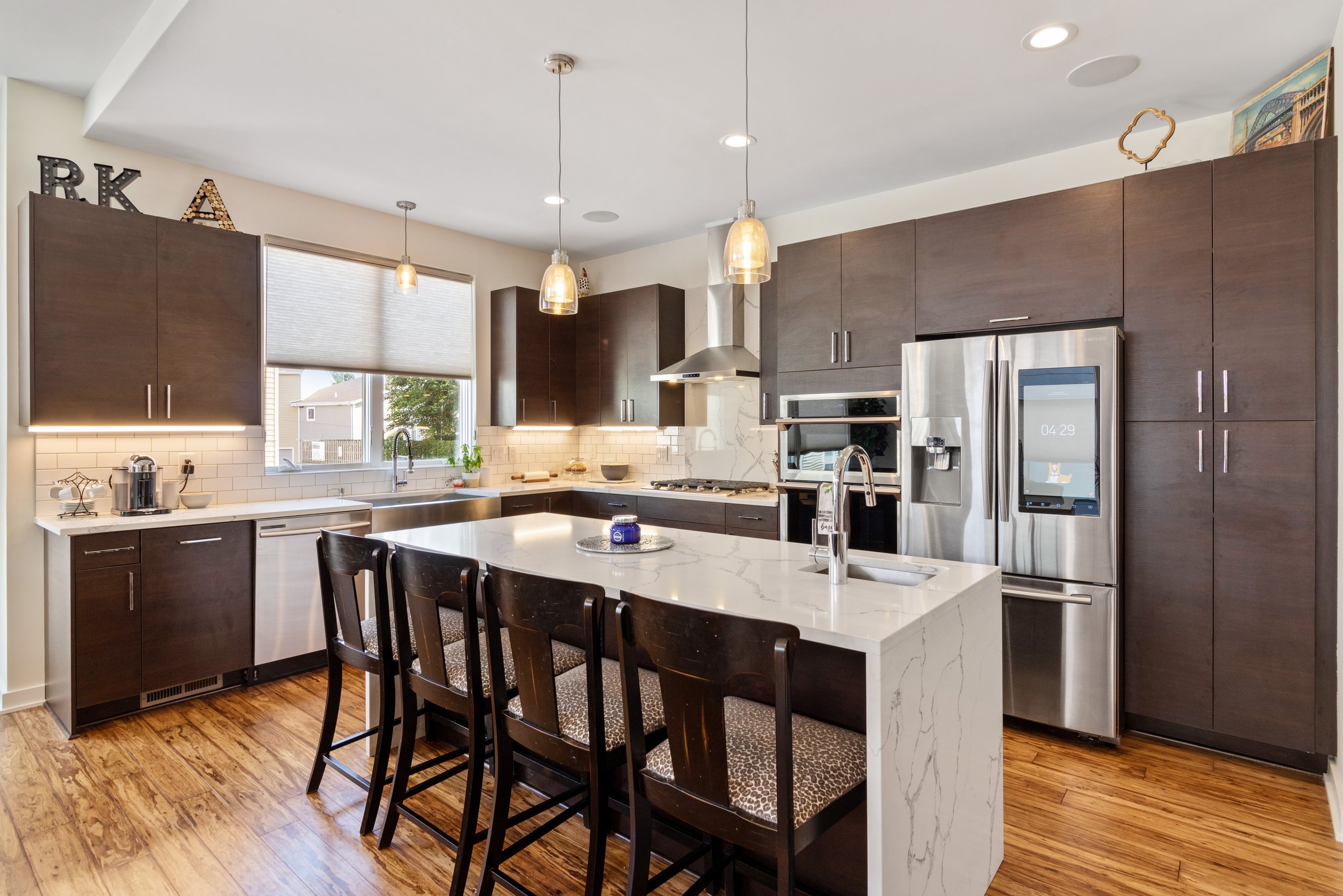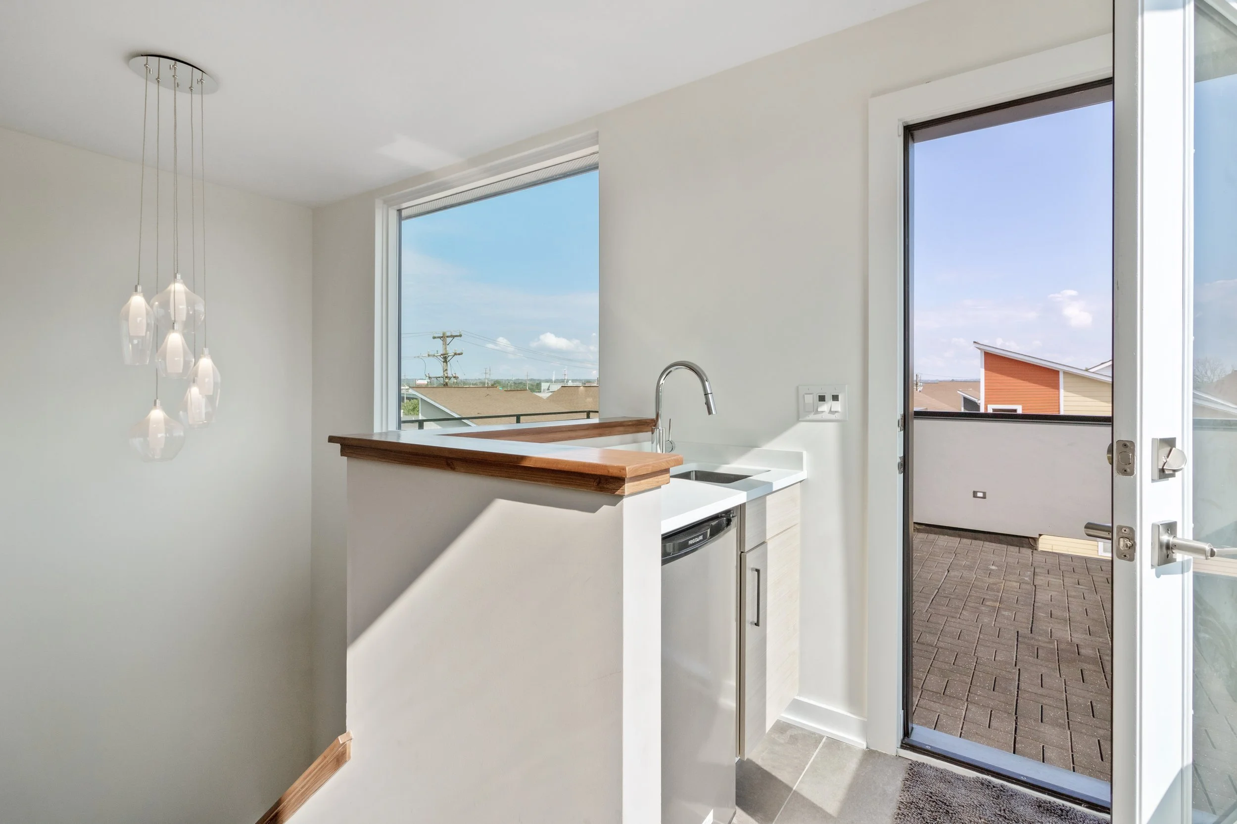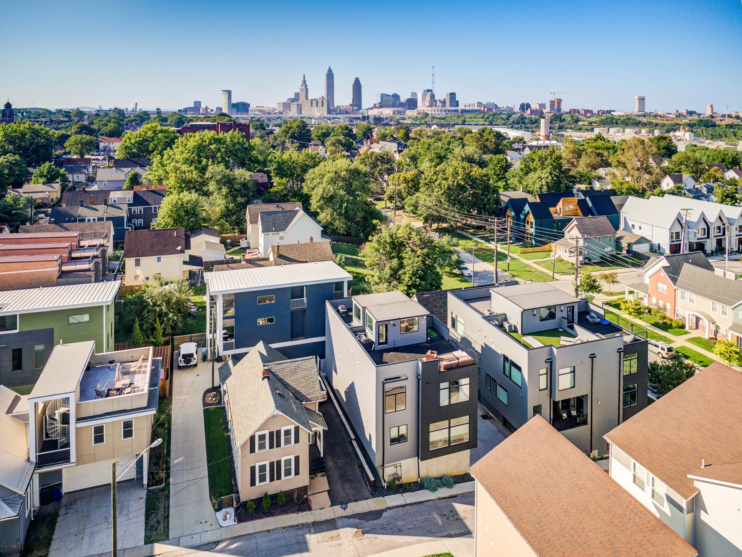 Welcome to refined, low-maintenance living in the heart of Tremont, just steps from the neighborhood’s acclaimed restaurants, cafés, galleries, and year-round energy. This exceptional property enjoys a valuable tax abatement in place through 2032, delivering meaningful savings for the next owner. Featuring two bedrooms, two full and one half baths, and an attached two-car garage, the townhome pairs elevated design with effortless everyday functionality. Custom built in 2017, every detail was thoughtfully curated. Rich bamboo flooring runs throughout, complementing the open, light-filled layout designed for both everyday living and memorable entertaining. Enter through the welcoming foyer and ascend to the main living level, where a stunning chef’s kitchen takes center stage. Quartz countertops, a dramatic waterfall island with seating, stainless steel appliances, subway tile backsplash, and abundant cabinetry create a space that is as beautiful as it is practical. The kitchen flows seamlessly into the expansive living area, where oversized windows invite in natural light and frame the urban surroundings. The third floor hosts a luxurious primary suite complete with a spa-inspired bath featuring a steam shower and a custom walk-in closet. A generously sized second bedroom with custom closet organization and a beautifully appointed full bath provide ideal accommodations for guests, family, nursery or a dedicated home office. At the top, a show-stopping rooftop level awaits. An indoor wet bar opens to a spacious private rooftop terrace with breathtaking views of the Cleveland skyline. Whether hosting friends under the city lights or enjoying a quiet evening above it all, this space delivers a true wow factor.