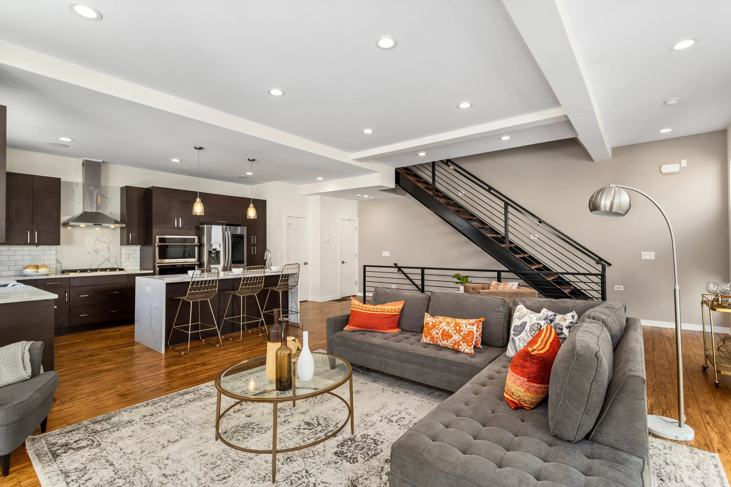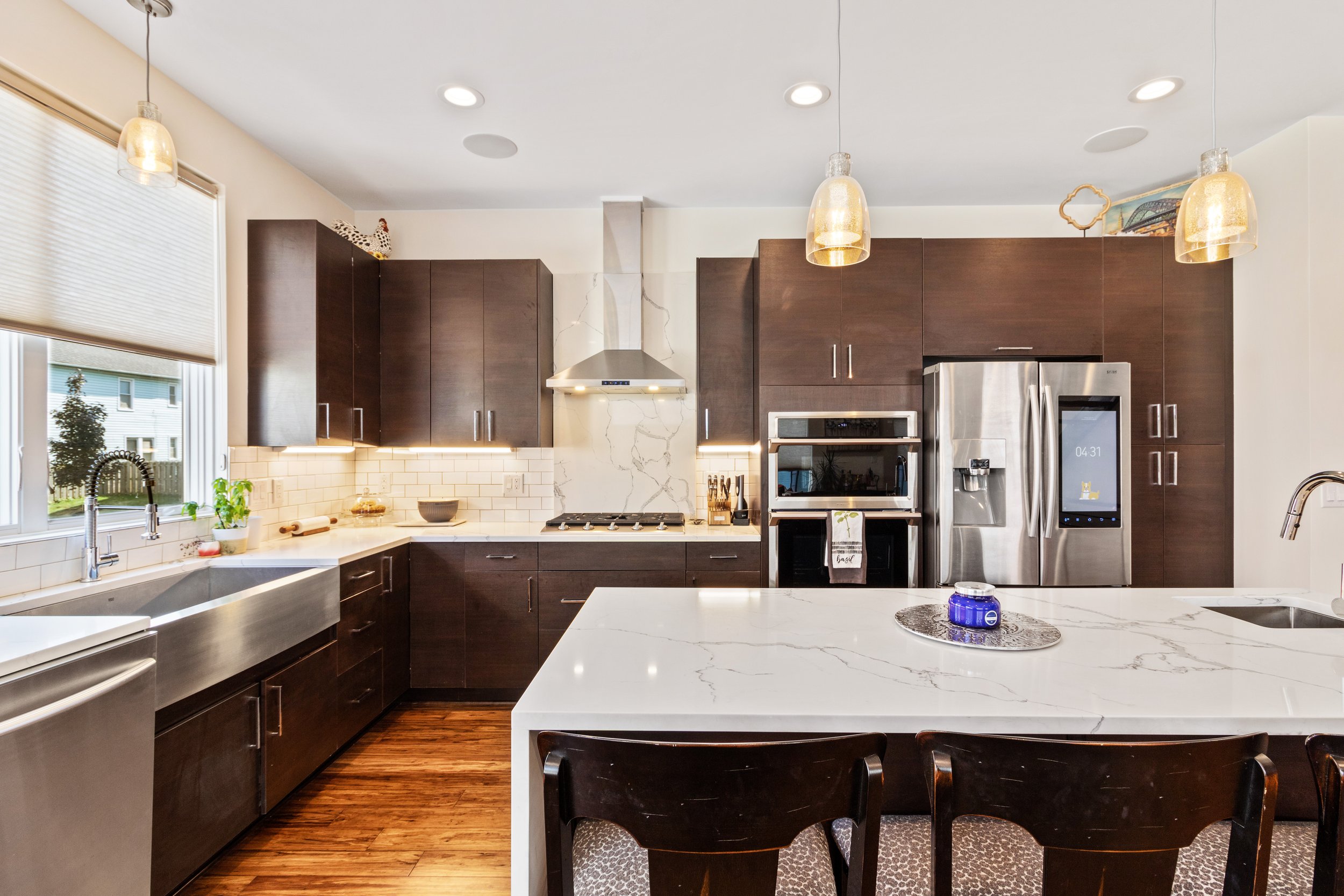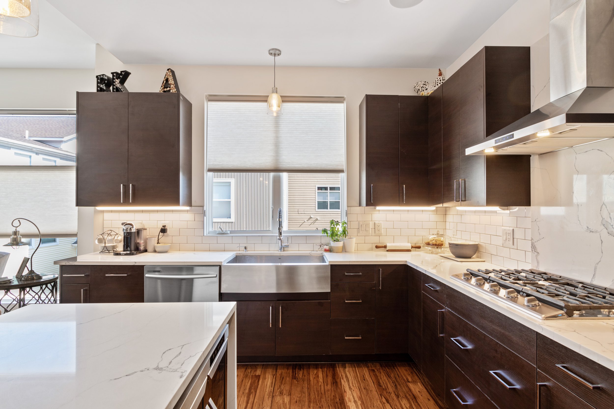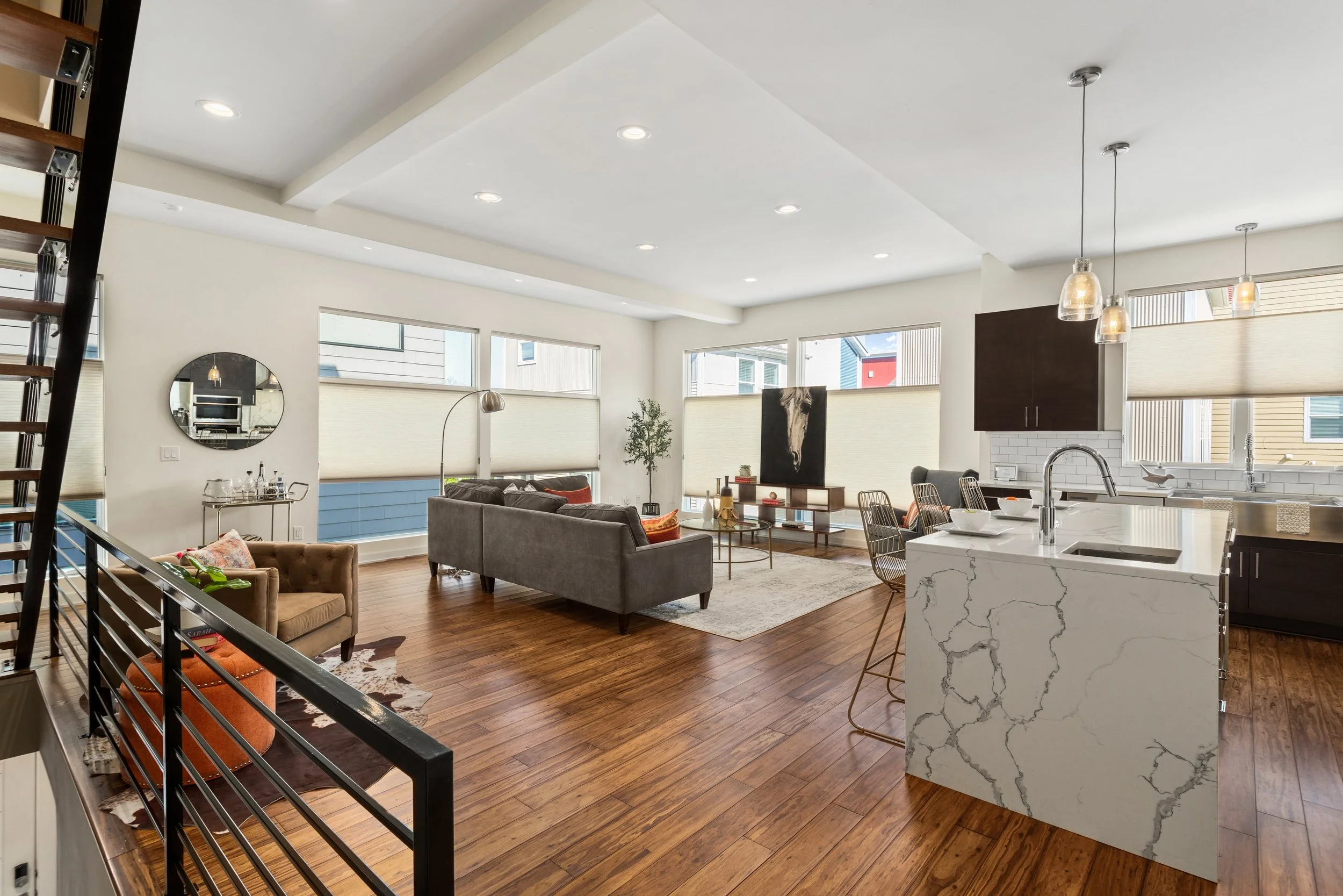 Welcome to refined, low-maintenance living in the heart of Tremont, just steps from the neighborhood’s acclaimed restaurants, cafés, galleries, and year-round energy. This exceptional property enjoys a valuable tax abatement in place through 2032, delivering meaningful savings for the next owner. Featuring two bedrooms, two full and one half baths, and an attached two-car garage, the townhome pairs elevated design with effortless everyday functionality. Custom built in 2017, every detail was thoughtfully curated. Rich bamboo flooring runs throughout, complementing the open, light-filled layout designed for both everyday living and memorable entertaining. Enter through the welcoming foyer and ascend to the main living level, where a stunning chef’s kitchen takes center stage. Quartz countertops, a dramatic waterfall island with seating, stainless steel appliances, subway tile backsplash, and abundant cabinetry create a space that is as beautiful as it is practical. The kitchen flows seamlessly into the expansive living area, where oversized windows invite in natural light and frame the urban surroundings. The third floor hosts a luxurious primary suite complete with a spa-inspired bath featuring a steam shower and a custom walk-in closet. A generously sized second bedroom with custom closet organization and a beautifully appointed full bath provide ideal accommodations for guests, family, nursery or a dedicated home office. At the top, a show-stopping rooftop level awaits. An indoor wet bar opens to a spacious private rooftop terrace with breathtaking views of the Cleveland skyline. Whether hosting friends under the city lights or enjoying a quiet evening above it all, this space delivers a true wow factor.